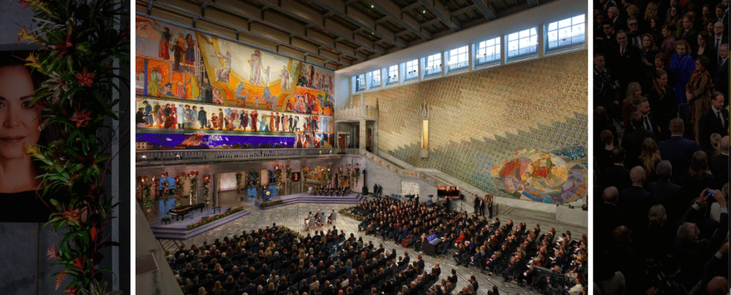 A large portrait of a smiling Machado hung in the Oslo City Hall to represent her. The audience cheered and clapped when Norwegian Nobel Committee head Joergen Watne Frydnes said during his speech that Machado would be coming to Oslo.