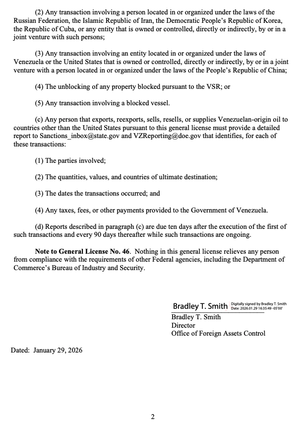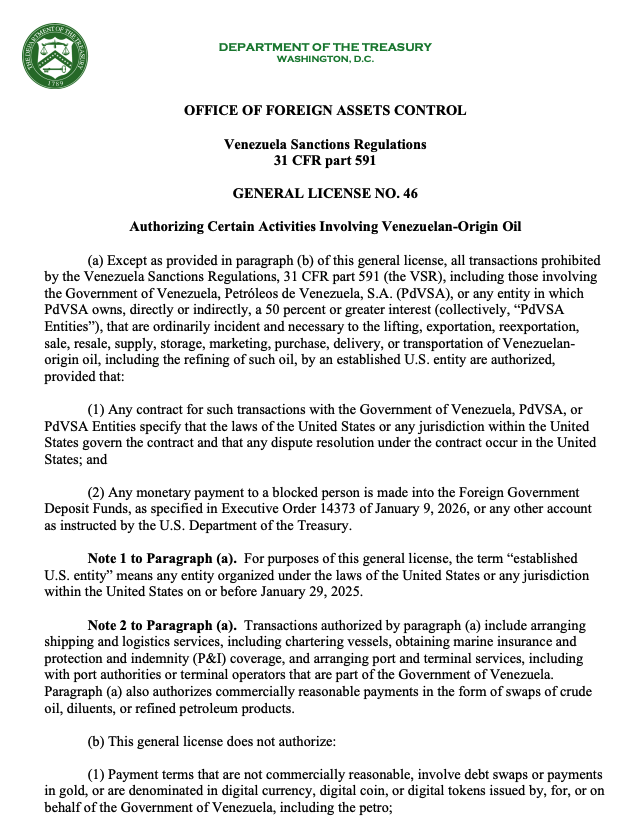 HOUSTON, TEXAS (By Editors with Energy Analytics Institute, 29.Jan.2026, Words: 46) — The US Office of Foreign Assets Control (OFAC) issued general license no. 46, authorizing certain activities involving Venezuelan-origin oil.