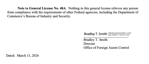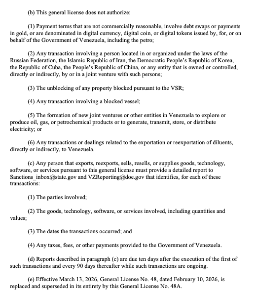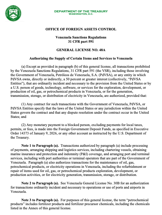 ATLANTA, GEORGIA (By Chad Archey, Energy Analytics Institute, 13.Mar.2026, Words: 48) — The US Office of Foreign Assets Control or OFAC issued general license no. 48A authorizing the supply of certain items and services to Venezuela.
