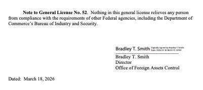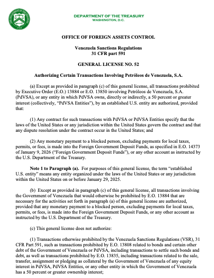 ATLANTA, GEORGIA (By Chad Archey, Energy Analytics Institute, 18.Mar.2026, Words: 50) — The US Office of Foreign Assets Control or OFAC issued general license no. 52 authorizing certain transactions involving Petróleos de Venezuela, S.A. (PDVSA).