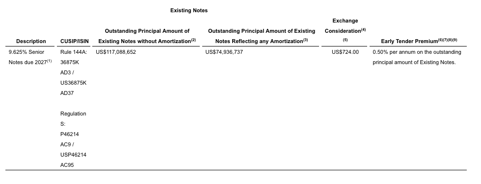 - The outstanding principal amount of the Existing Notes of US$117,088,652 is subject to a variable amortization factor (the “Amortization Factor“) which is calculated in accordance with amortization payments made in accordance with the terms and conditions of the Existing Notes. No future amortizations are expected to be made by the companies under the Existing Notes. As of the date hereof, and on or after the Early Participation Date and the Expiration Date, the Amortization Factor is, and is expected to be, 64%.