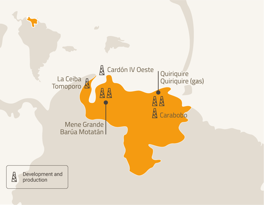 Repsol has a 40% stake in Petroquiriquire, together with CVP, operating in Quiriquire (Monagas), Mene Grande, and Barúa Motatán, located in the states of Zulia and Trujillo.
