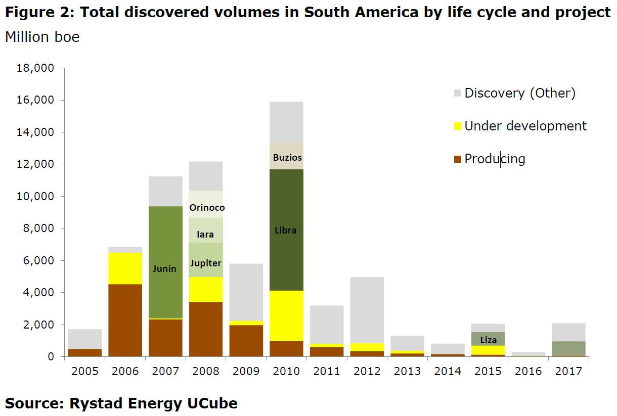Figure 2 shows the discovered volumes in South America from 2005 to 2017, split by life cycle and key unsanctioned projects. By far the best year for exploration in the region was 2010, when almost 16 billion boe were discovered. The Libra and Buzios discoveries in Brazil make up over 50% of the 2010 total discovered volumes. Other large discoveries include the Lula field (2006 and 2009), as well as Junin, Iara, Jupiter, and Orinoco project discoveries (2007 and 2008). Since 2010, there has been a visible reduction in discovered volumes. 2012 was an exception to the trend when Petrobras made the Carcara and Pao de Acucar discoveries in Brazil (now Statoil-operated). We saw some growth in discovered volumes in the region also in 2015. Back then, ExxonMobil made the Liza discovery, adding 1200 million boe in reserves in Guyana. The phase 1 of the project has already been sanctioned and start-up is planned for 2020. Last year, the company added additional 900 million boe to Liza by discovering Turbot and Snoek fields. Although rather little resources were found since 2010 compared to the historical levels, significant production contributions are expected from the discoveries that have been made in the past twelve years.